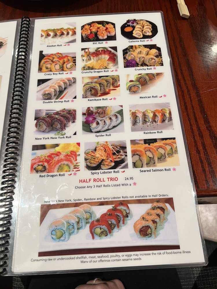 Choose any 3 half rolls listed and New York New York, spider, rainbow, Shogun roll and spicy lobster rolls not available in half orders.